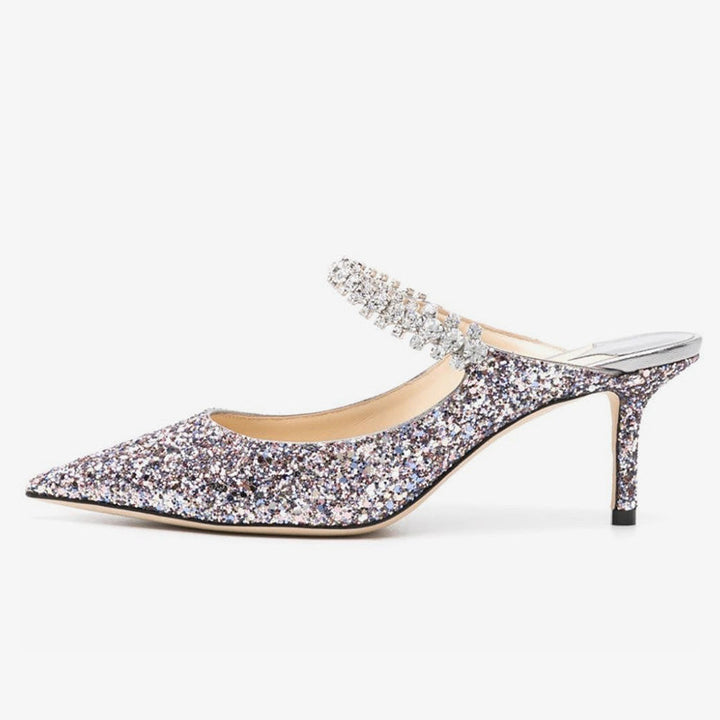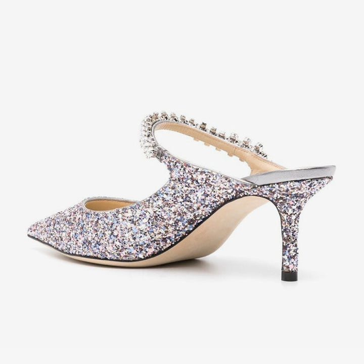 Radiating glamour in every step, these multicolor silver glitter mules are adorned with a crystal-embellished strap for a dazzling finish. The pointed toe and sleek open-back silhouette are elevated by a slender 65mm stiletto heel, while the leather lining and sole ensure a luxurious feel. A statement slip-on design made to shine.