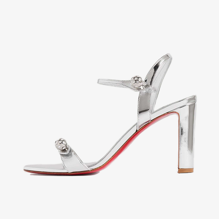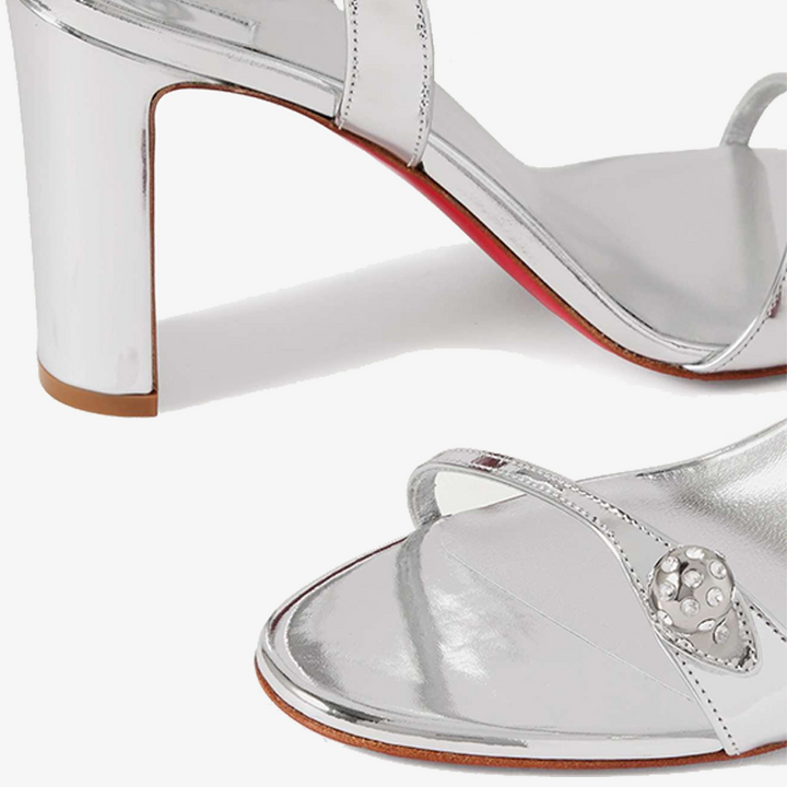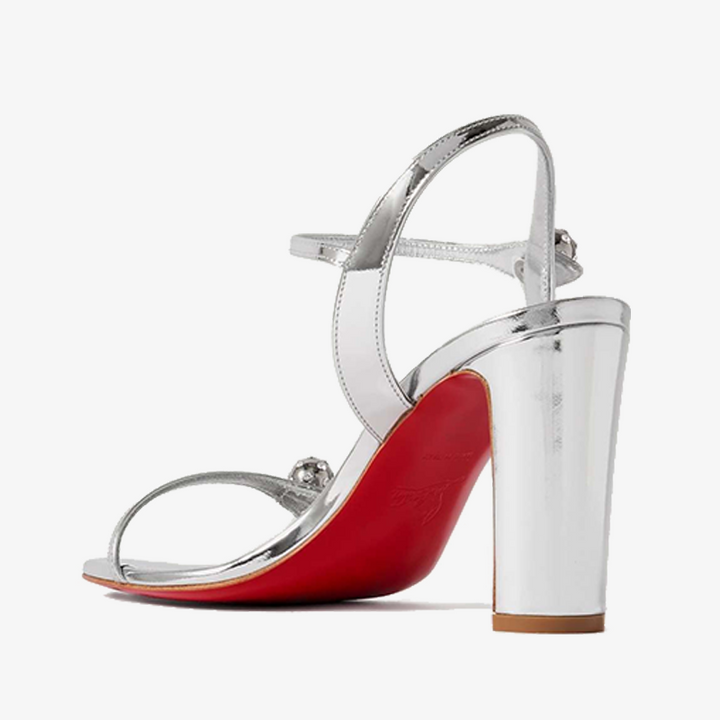 Truly out of this world, this sandal is crafted from silver leather and features slim straps adorned with crystal-encrusted spheres for a touch of glamour. A snap-fastening ankle strap adds elegance, while the red lacquered soles perfectly complement any pedicure.