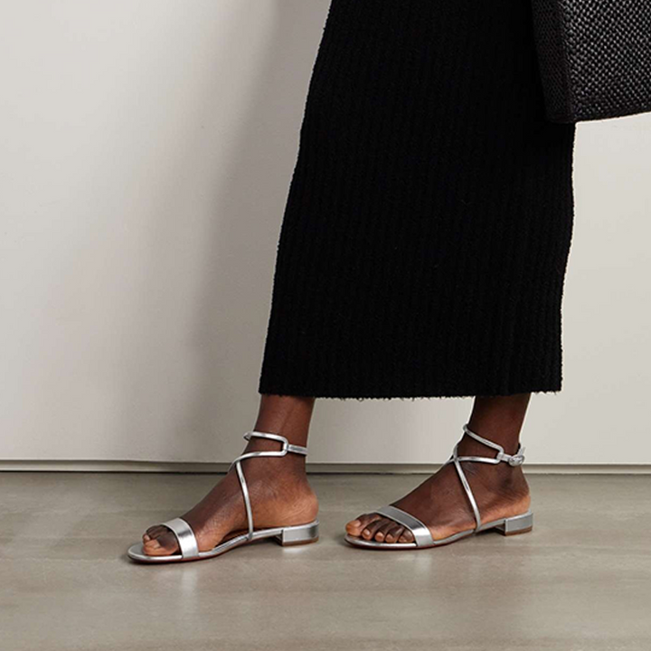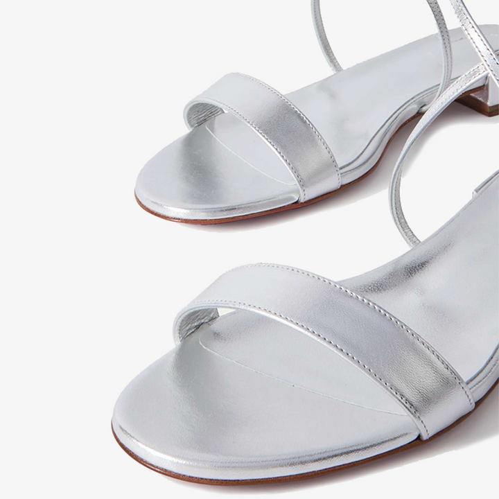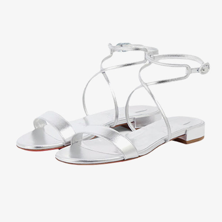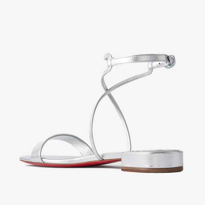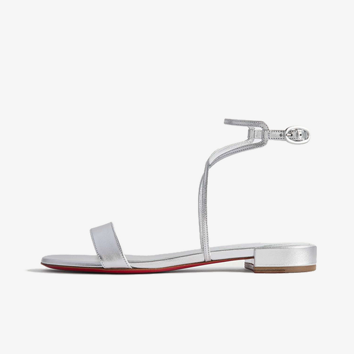 These sandals are defined by their fixed, foot-framing straps, with a buckle-fastening ankle strap to perfect the fit. Crafted from silver calf leather, they feature red-bottomed soles that reveal a striking detail with each step.These sandals feature a 30 mm heel, offering an elegant and sleek silhouette.