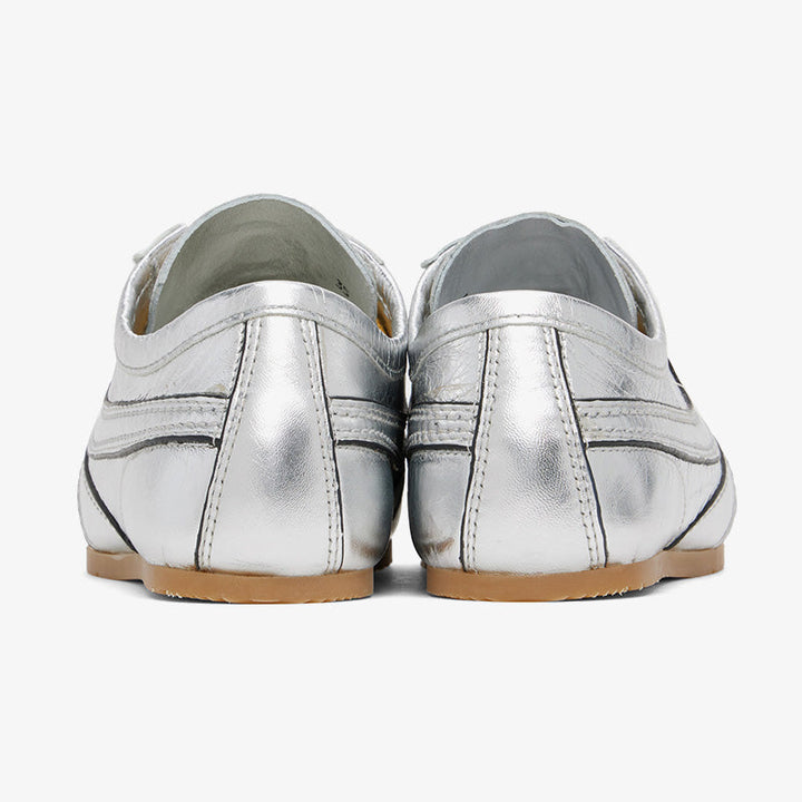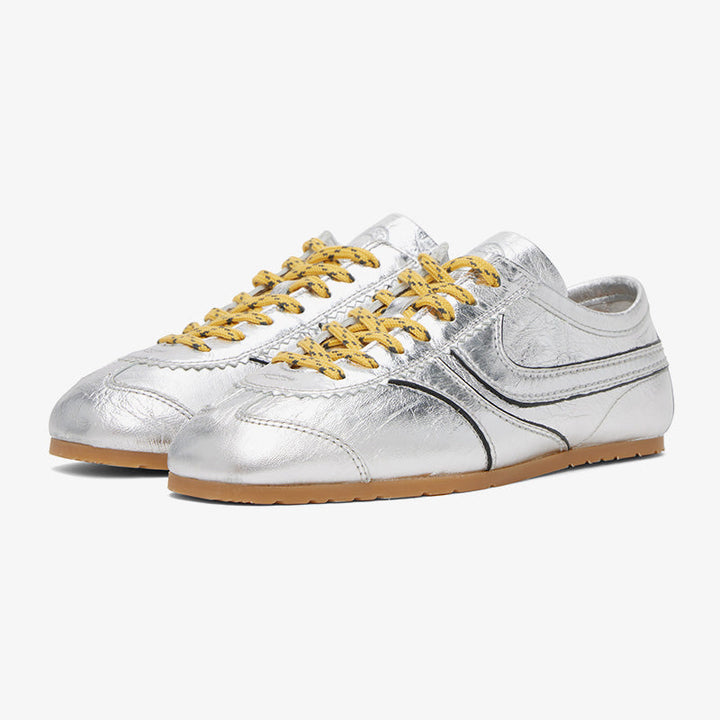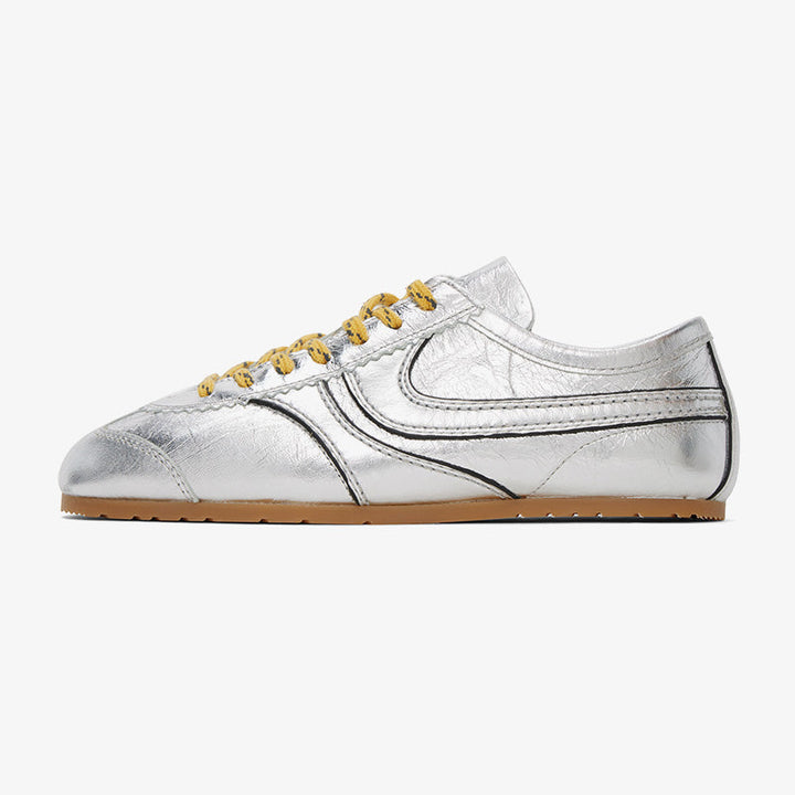 These silver metallic sneakers combine a sleek, futuristic look with the timeless appeal of low-top grained calfskin. Featuring a square toe and serrated edge at the lace-up closure, they offer both style and functionality. The stripe appliqués at the sides add a subtle yet eye-catching detail, while the rubber sole ensures comfort and durability. A must-have for those looking to elevate their casual wardrobe with a touch of metallic shine.