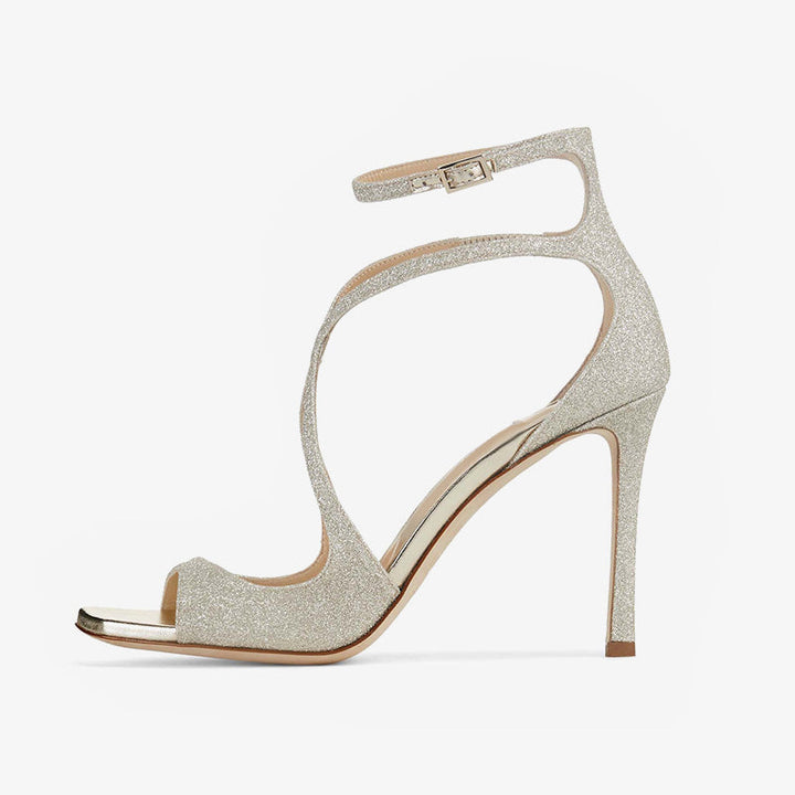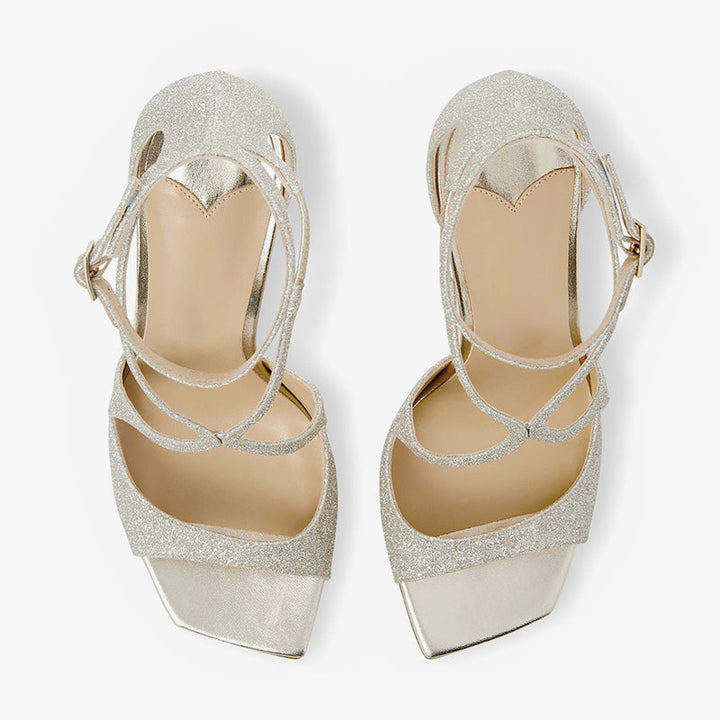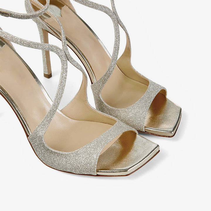 These sandals feature delicate curved straps that elegantly wrap the foot, crafted in shimmering dusty glitter fabric. Designed with a modern square open toe, adjustable ankle strap, and a sleek 110mm slim heel for a sophisticated finish.Color:silver