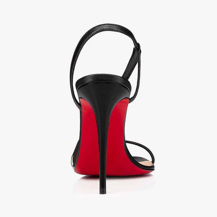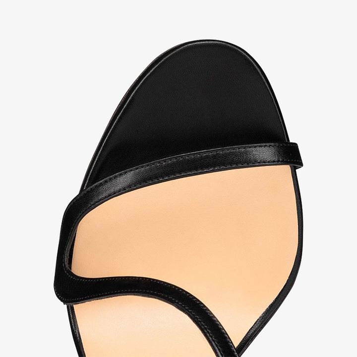 Combining simplicity and refinement, this sandal offers a contemporary twist on the classic stiletto. The innovative upper features a narrow strap with a two-piece construction, winding around the foot and ending in a wavy design over the toe. Crafted from glossy black calf leather, it rests on a slender 100 mm stiletto heel, adding a touch of elegance to any occasion.