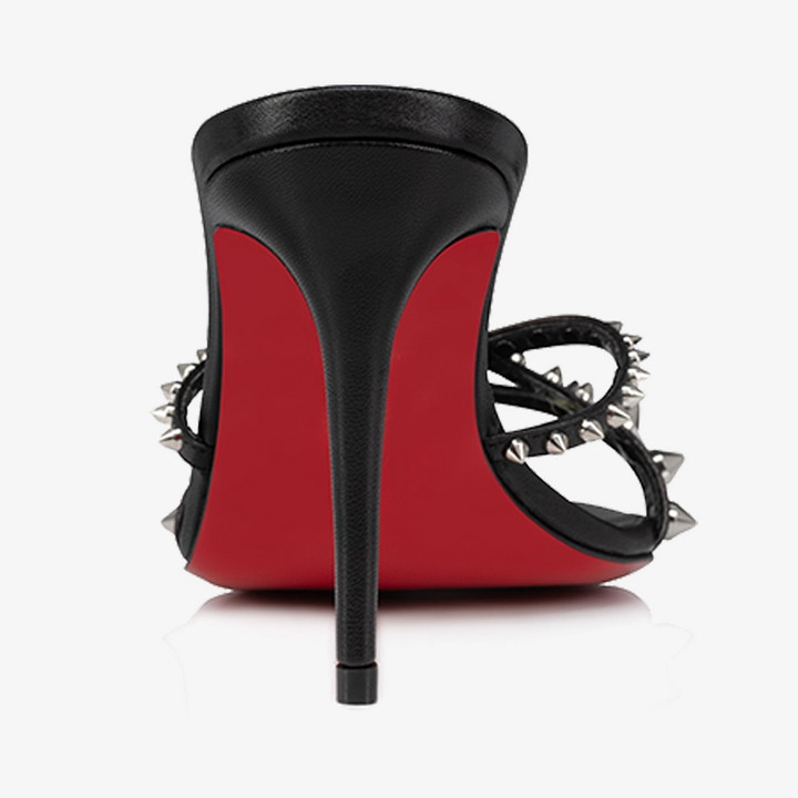 This elegant sandal features slender straps crossing over the foot, each adorned with bold spikes for an edgy touch. Crafted from black calf leather, it sits on a refined 80 mm heel, combining sleek sophistication with a daring design.