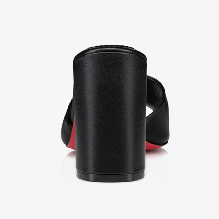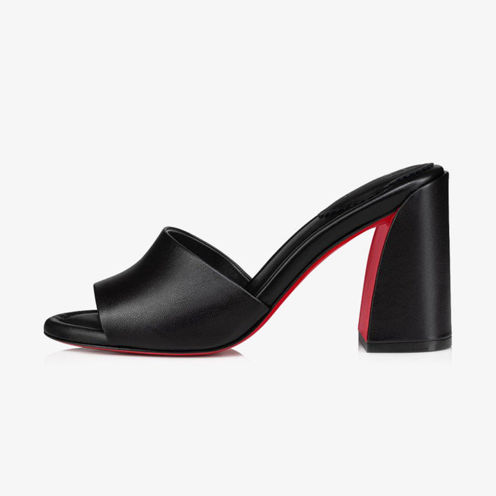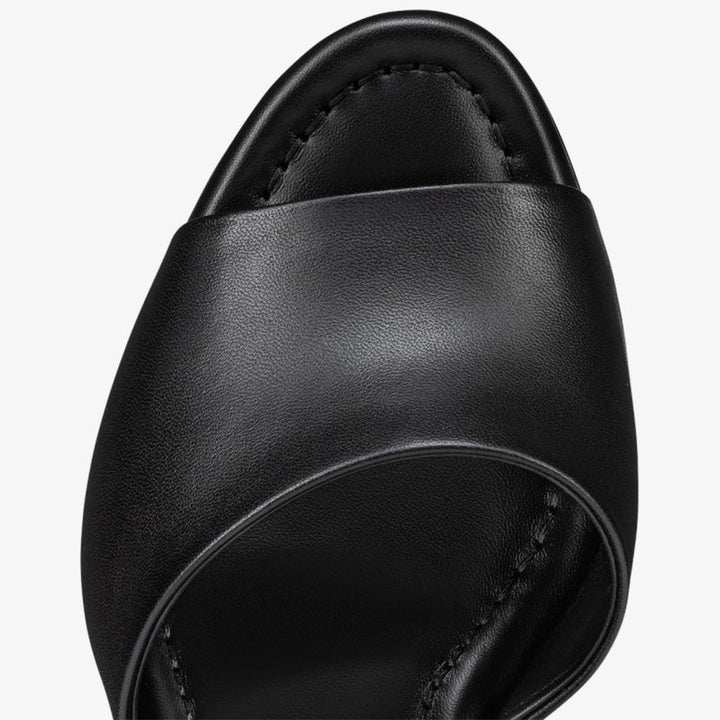 This refined sandal features a square, angled heel that adds a modern edge to a timeless silhouette. Crafted in smooth black leather, it showcases a clean, slender strap that elegantly frames the foot. The padded insole ensures comfort, while the approximately 100 mm heel delivers graceful height. Perfect for summer days and evening soirées, the black hue enhances its versatile, understated charm.