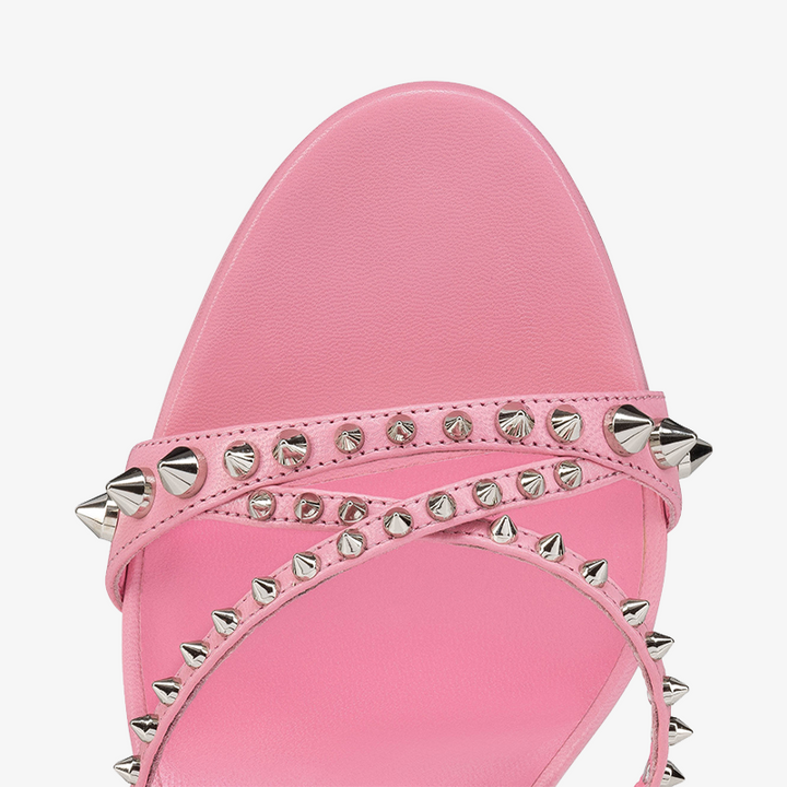 The sandal features slender straps crossing over the foot, adorned with bold spikes for an edgy look. This sleek light pink leather model sits on an 80 mm heel, offering both style and comfort.