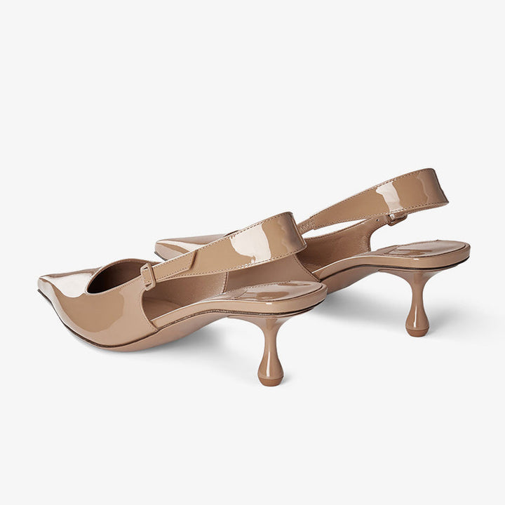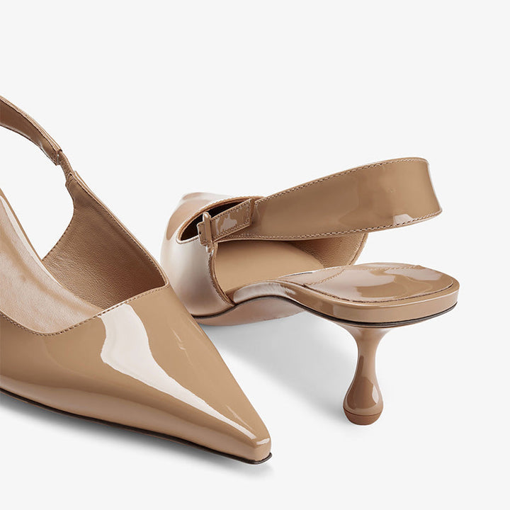 A modern take on a timeless silhouette, these patent leather slingback pumps feature a sharply pointed toe and a refined square-cut vamp. The adjustable strap ensures a secure fit, while the sculpted drop heel adds a contemporary touch. Finished with a smooth leather lining and sole, they bring effortless elegance to any look.The heel height of this pair is 30mm.