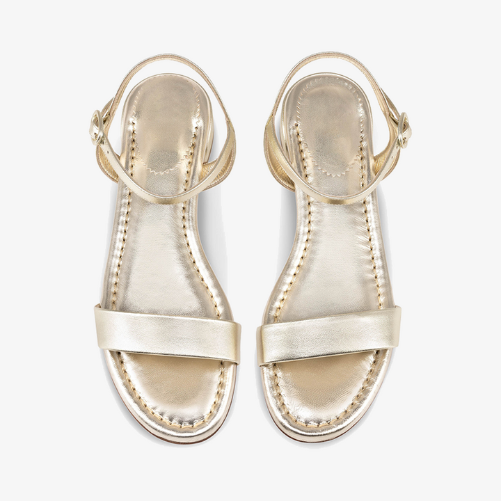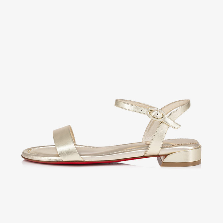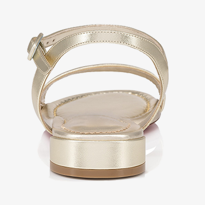 The sandal features sleek lines, crafted in gold calf leather. It showcases two elasticated straps with tonal buckles for an elegant finish, while the slender strap enhances the foot, adding a touch of sophistication.It sits atop a 30 mm heel.