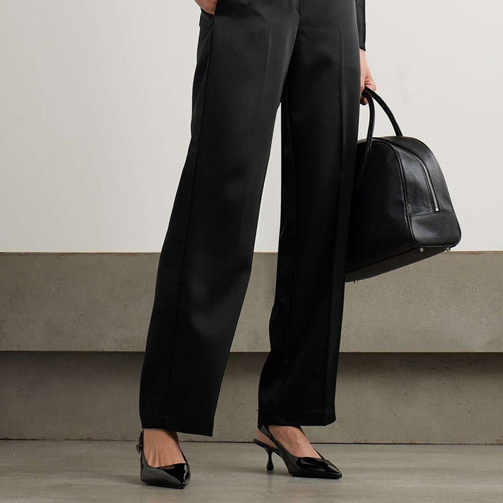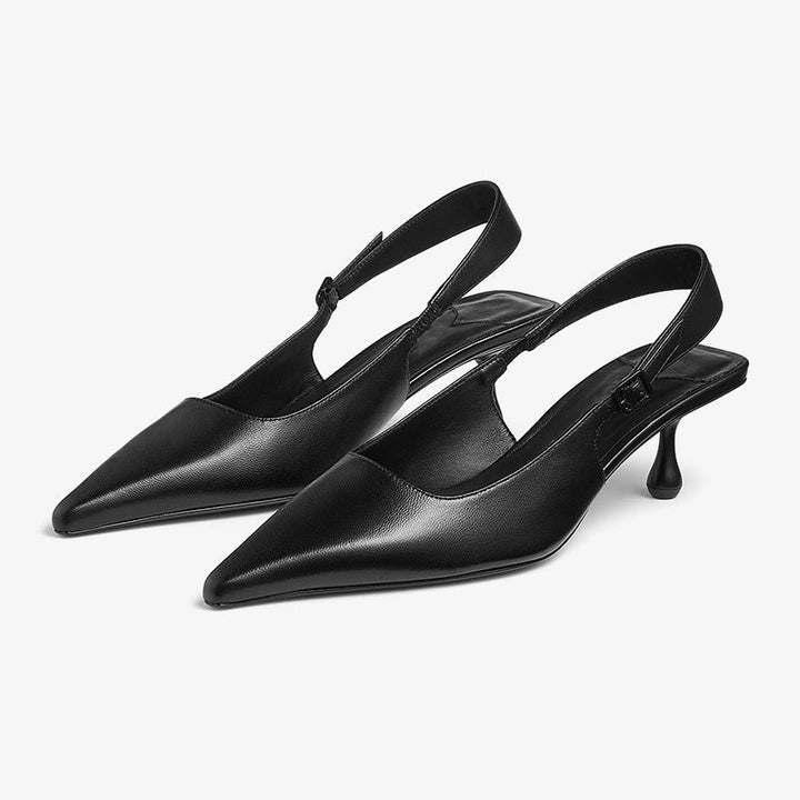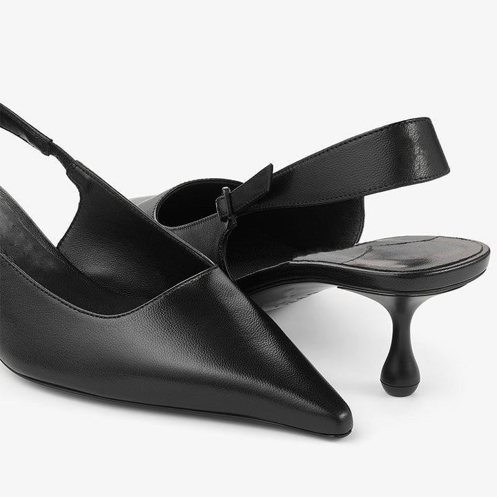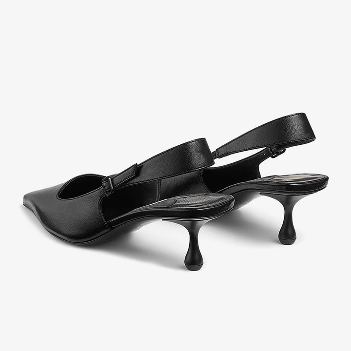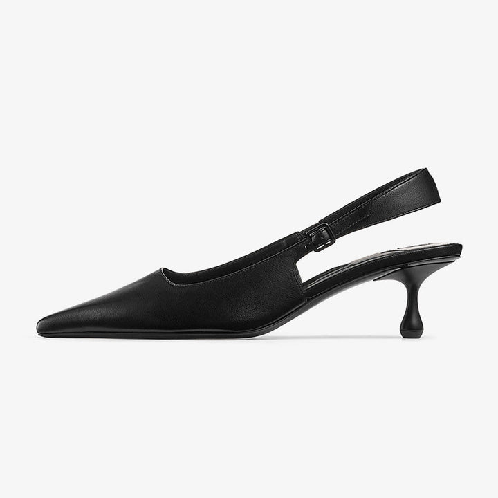 A contemporary take on a timeless silhouette, these slingback pumps feature supple leather, a sculpted drop heel, and a sharp pointed toe. The square-cut vamp adds a modern edge, making them a versatile choice for effortless sophistication.