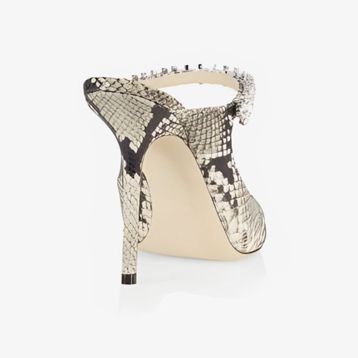 These mules are crafted from snakeskin-embossed leather and feature a crystal-embellished vamp strap. With a pointed toe and a 100mm stiletto heel, they offer a sleek, leg-lengthening look. Slip-on style with a leather sole for added sophistication.