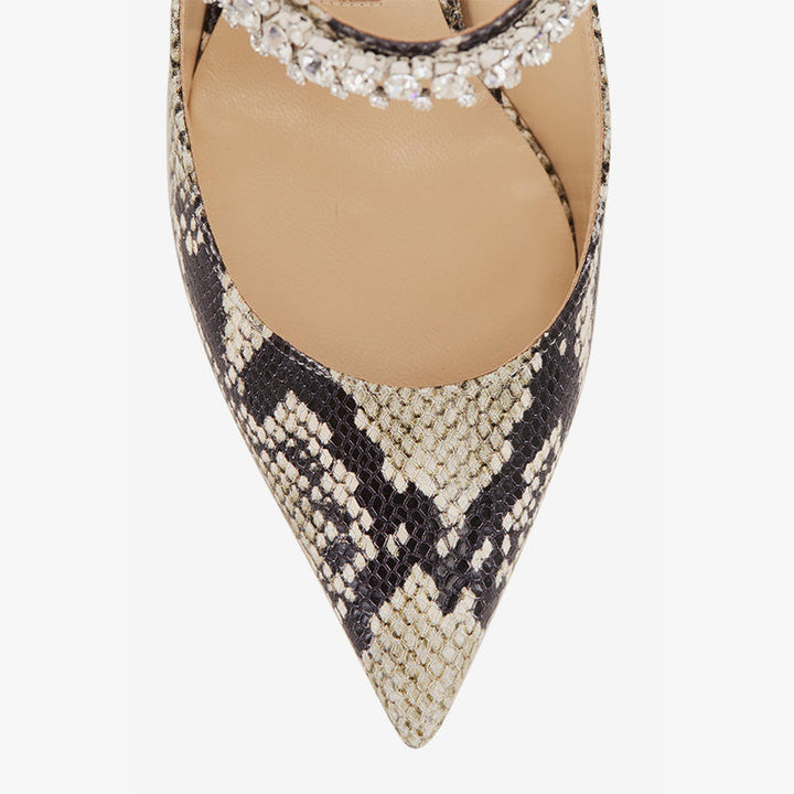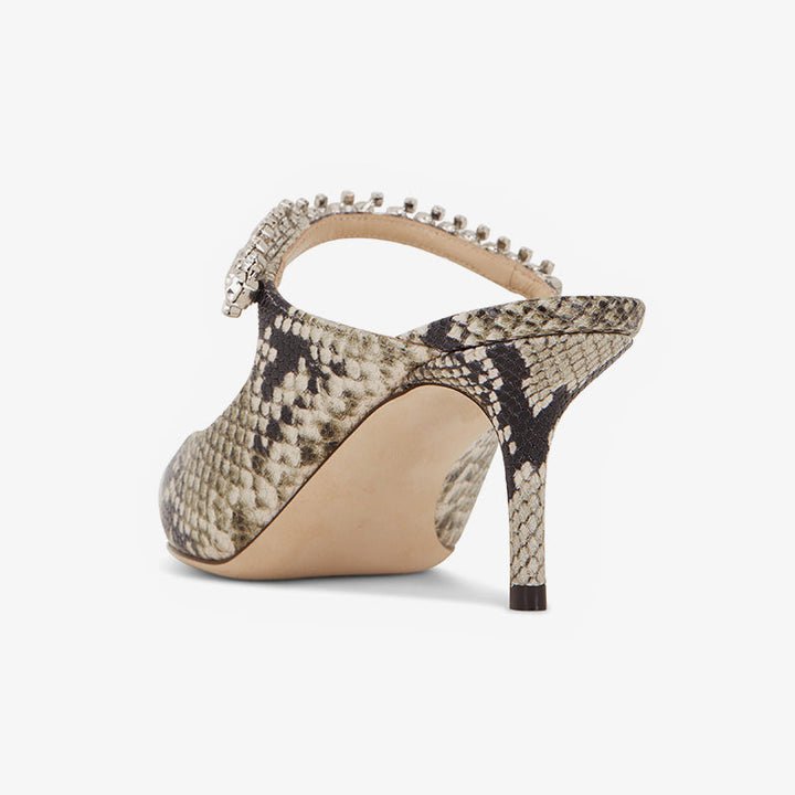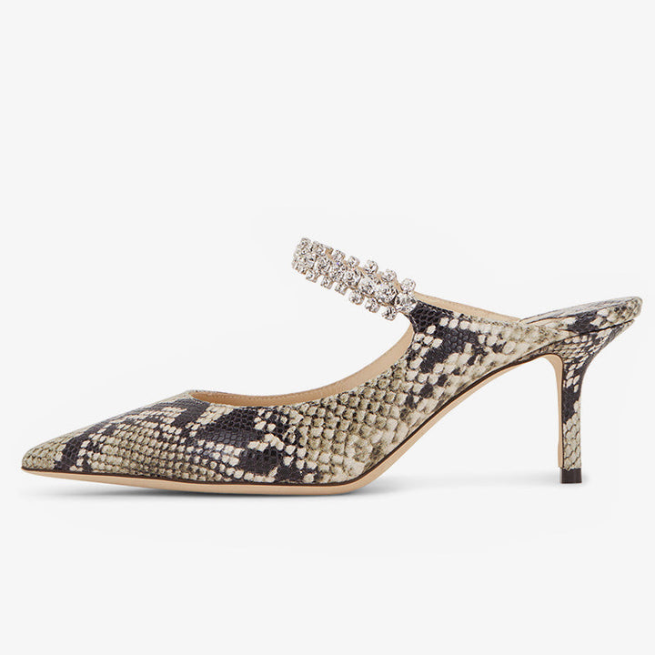 These mules are crafted from snakeskin-embossed leather and feature a crystal-embellished vamp strap. With a pointed toe and a 65mm stiletto heel, they offer a sleek, leg-lengthening look. Slip-on style with a leather sole for added sophistication.