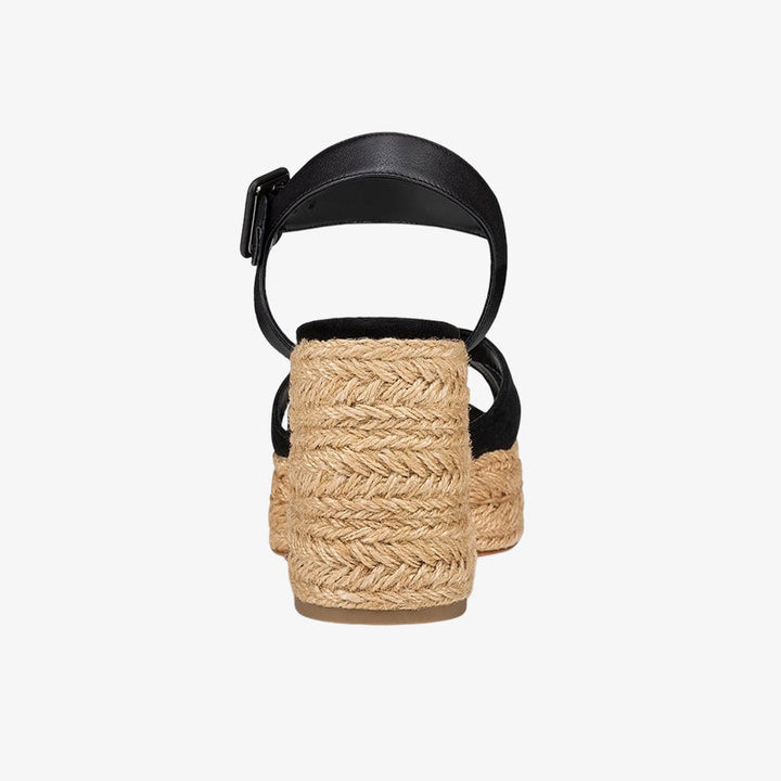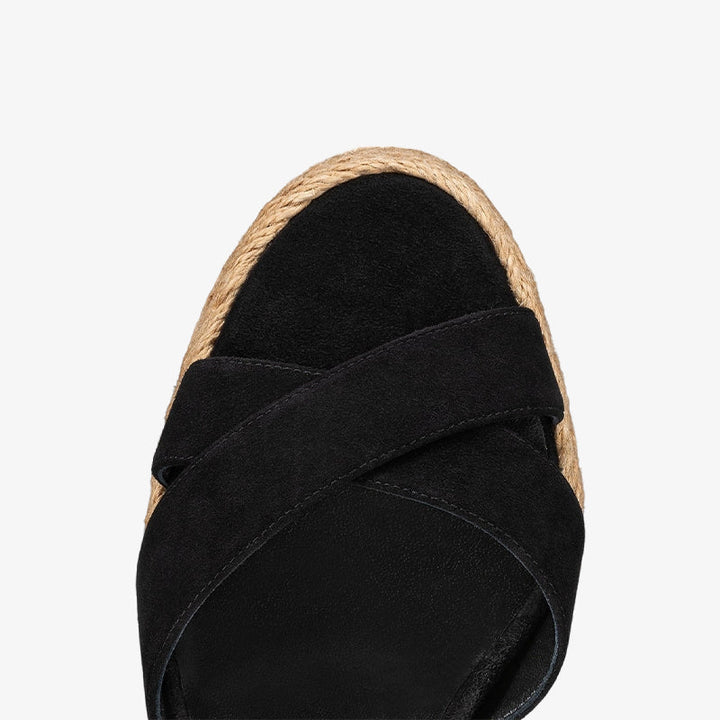 A modern take on the classic sandal, these sandals feature black suede crisscross straps and a braided sole. They feature a sleek leather ankle strap and metal buckle for a creative, architectural look.