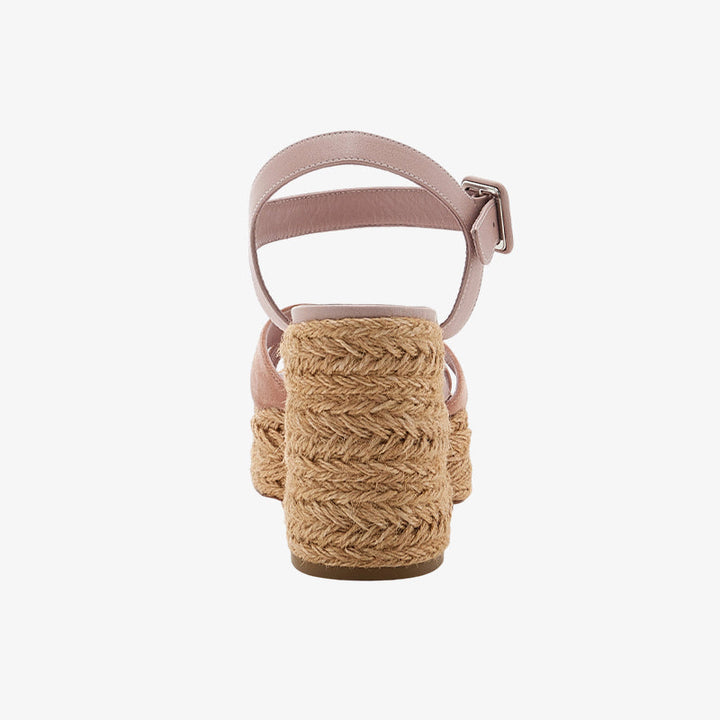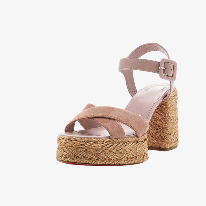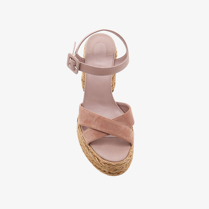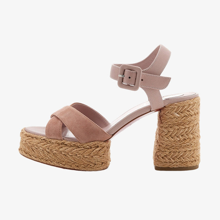 These casual yet elegant sandals are crafted from soft pink suede with a jute-braided platform and block heel for added comfort. Finished with a secure buckle closure for a perfect fit.
