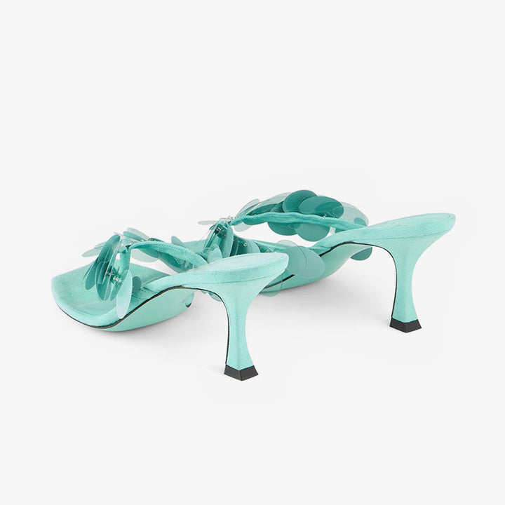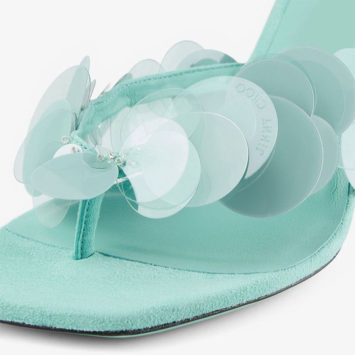These teal suede mule sandals feature metallic disc sequins for a retro-chic touch. Designed with a square toe, sculpted 70mm heel, and leather lining, they combine vintage-inspired glamour with modern elegance.