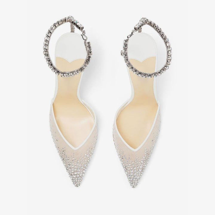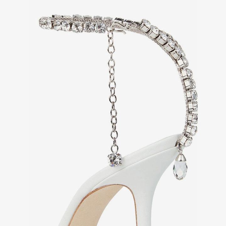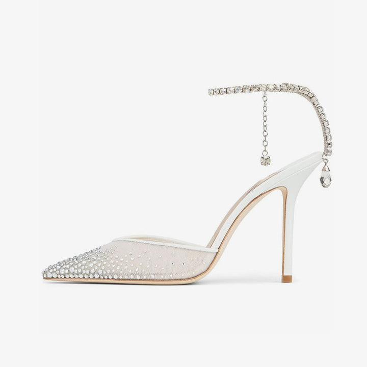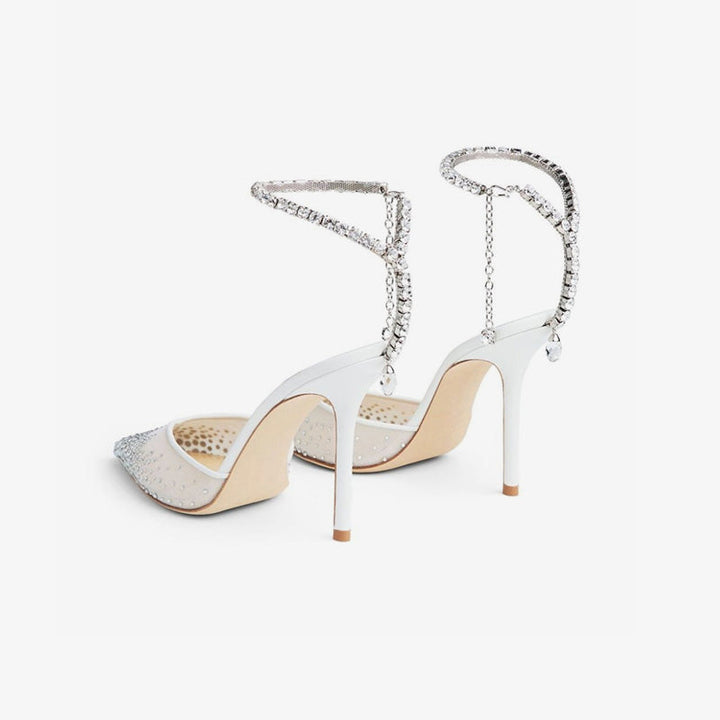These white pumps are crafted from calf leather and mesh, adorned with sparkling crystal embellishments. Featuring a pointed toe, buckle-fastening ankle strap, and an adjustable-length chain, they are set on a 100mm stiletto heel with a leather sole. A perfect blend of elegance and glamour. Color: white