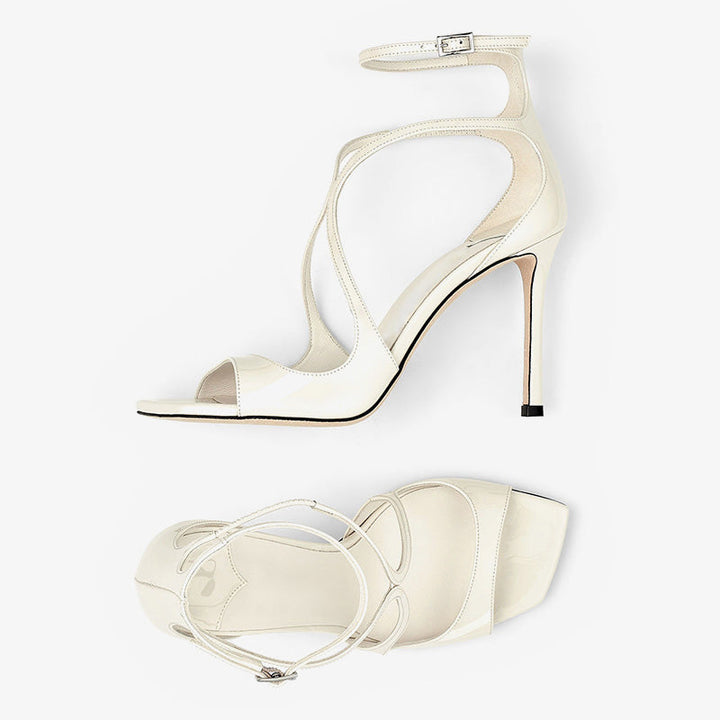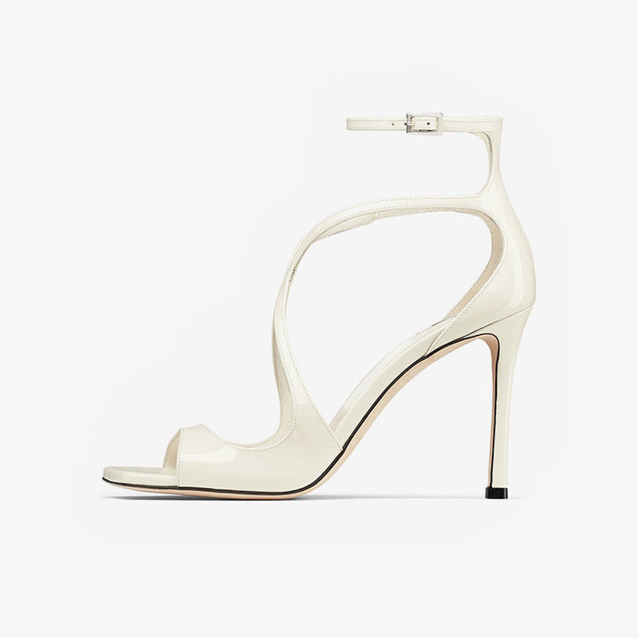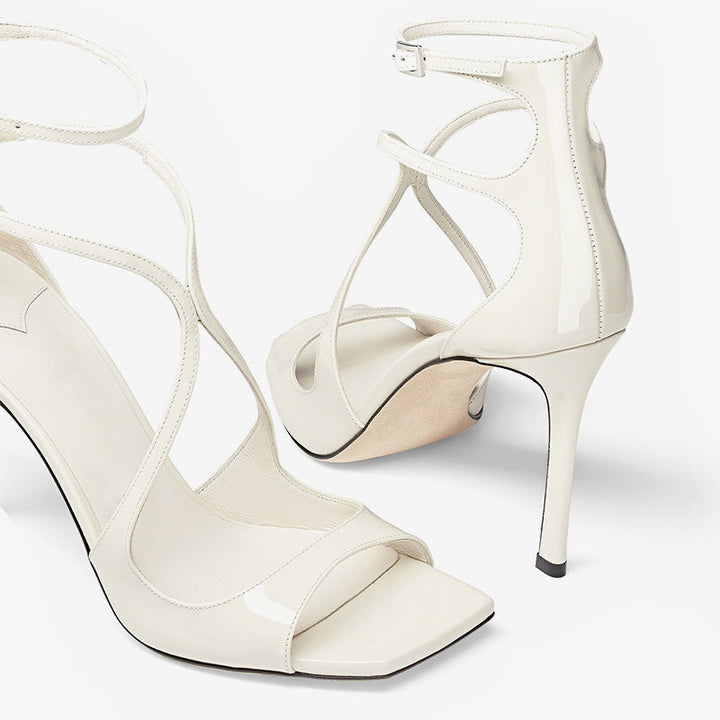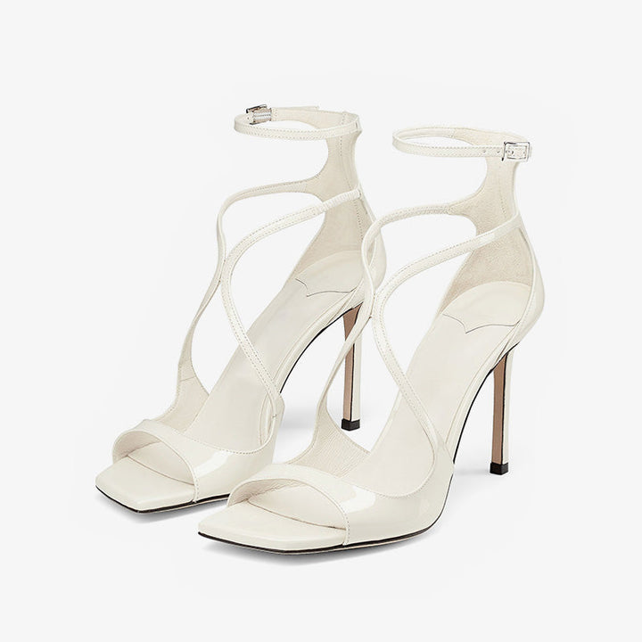 Elegant and feminine, these leather sandals feature signature curved double straps with elastic inserts for a flexible fit. Designed with a modern square toe, slim 95mm heel, and hand-applied sole, they blend sophistication with comfort.Color:white