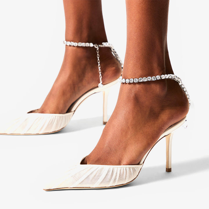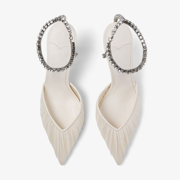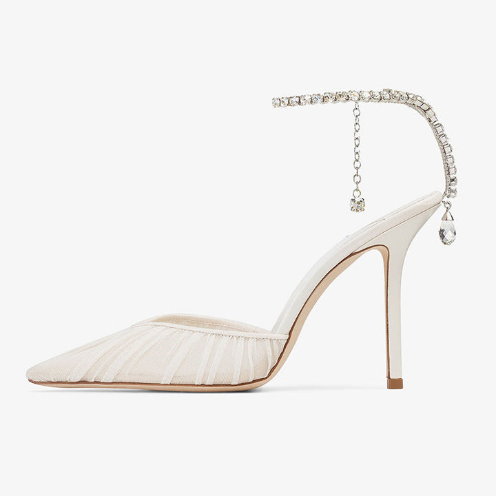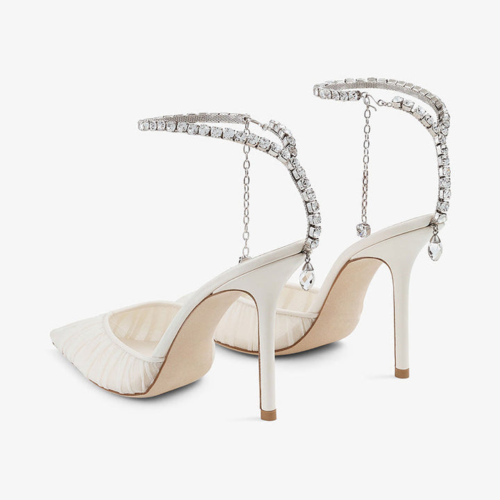 Elegant and airy, these white stiletto heels feature a mesh-effect finish that adds a delicate, modern touch. Designed with a pointed toe and slim heel for a refined silhouette.