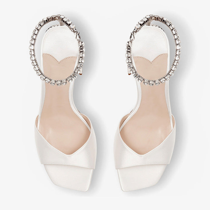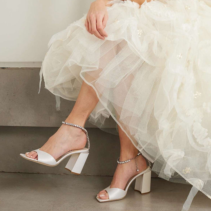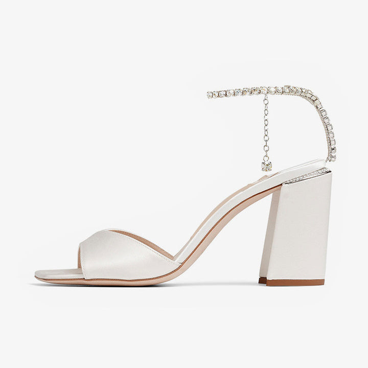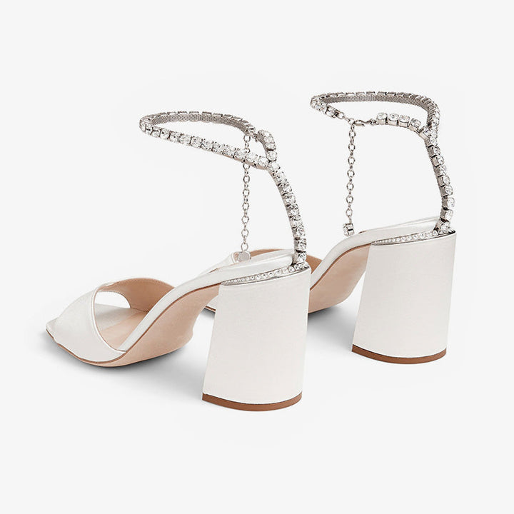 Crafted in smooth satin, these sandals feature a statement crystal anklet with a delicate drop crystal that drapes elegantly at the heel. Designed with a square toe and secure bracelet clasp, this glamorous pair sits on an 85mm block heel for both style and comfort. Finished with leather lining and sole.