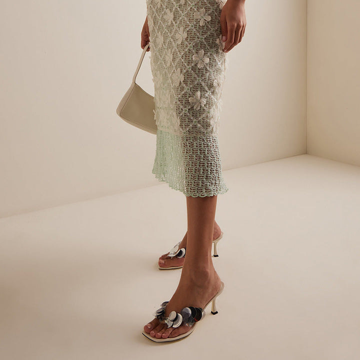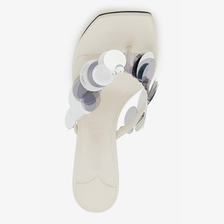 Crafted from soft suede, these slip-on thong sandals feature a 70mm heel and are embellished with oversized silver paillette sequins for a bold, glamorous finish.