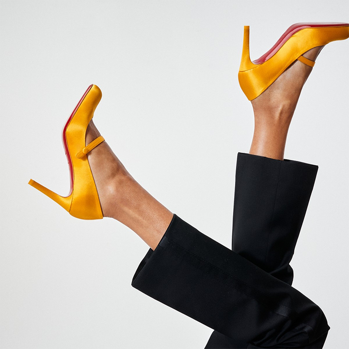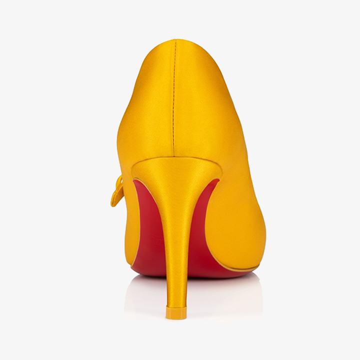 This timeless pump features a rounded toe and an audacious low-cut vamp, highlighted by a slim strap fastened with a press-stud. Crafted in luxurious yellow crepe satin, it reveals the foot with a delicate touch. Set on an 80 mm stiletto heel, this model embodies sleek lines and urban elegance.