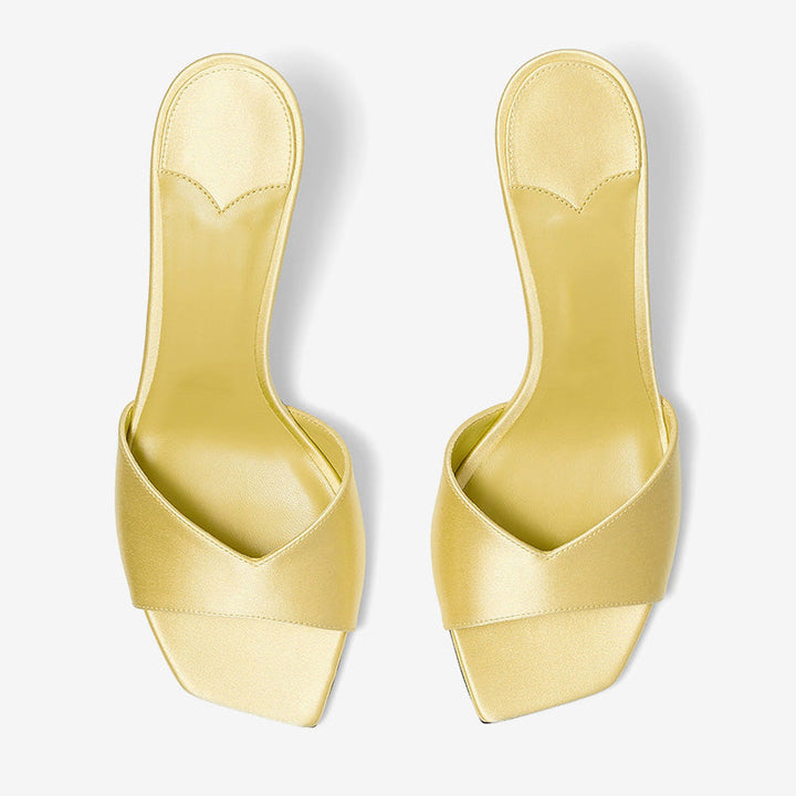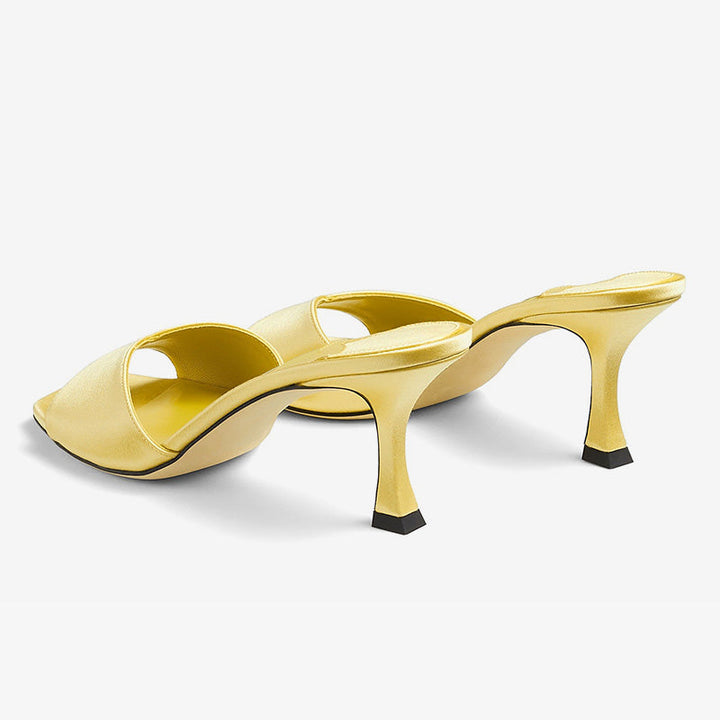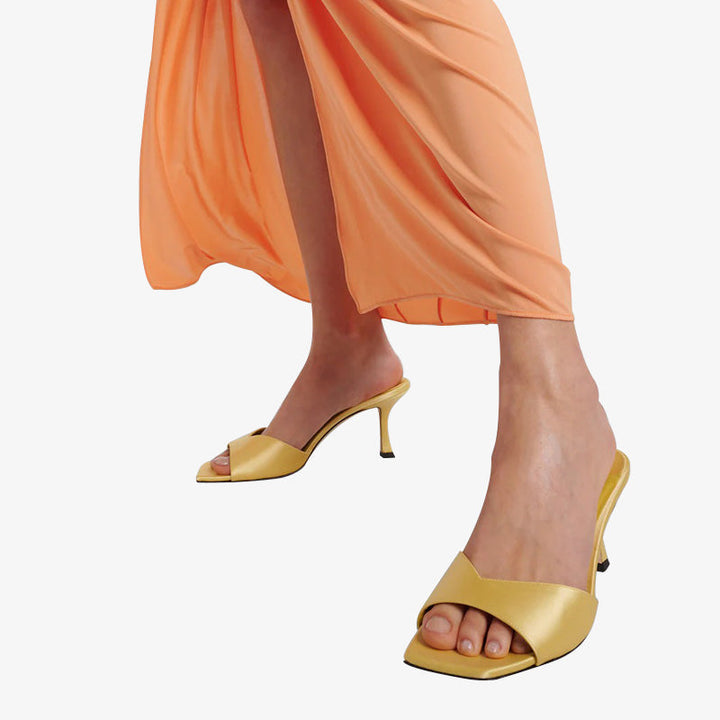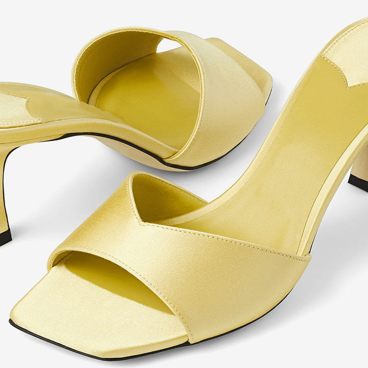 Crafted from lustrous yellow satin, these slip-on mules feature a low-cut vamp, square open toe, and sculpted mid-height heel for a sleek, modern look. Color:yellow
